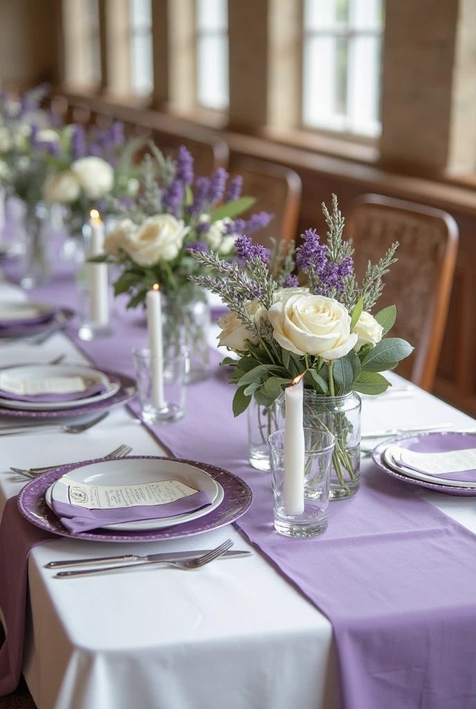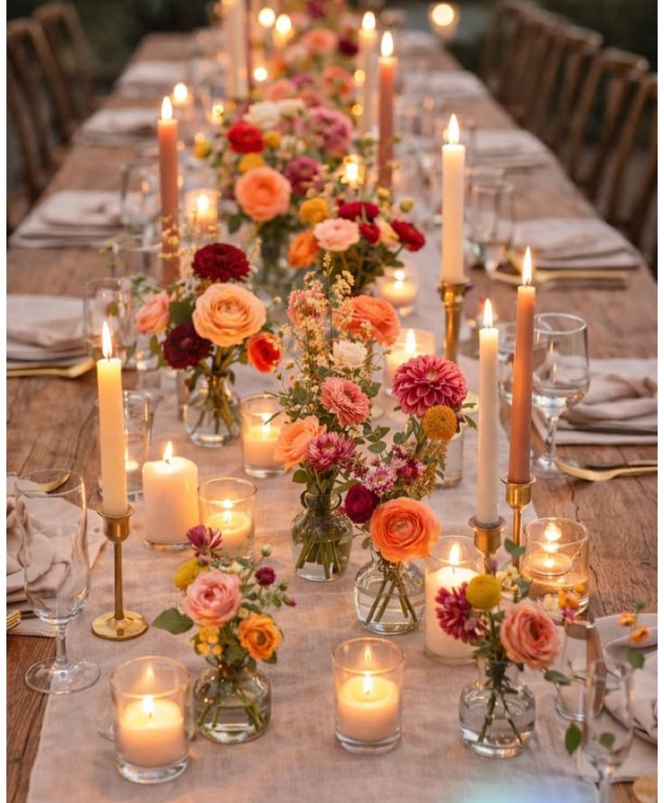 Nothing feels more timeless than fresh flowers paired with soft candlelight. A low floral arrangement made with tulips, roses, or ranunculus instantly brings life to the center of your table without blocking conversation. Instead of one large bouquet, consider breaking florals into smaller vases spaced evenly along a runner. Taper candles placed at varying heights add dimension and warmth, especially for evening gatherings. Because the arrangement stays low and elongated, it feels elegant rather than bulky. This style works beautifully for both intimate brunches and larger dinners, offering just enough visual drama without overwhelming the space.