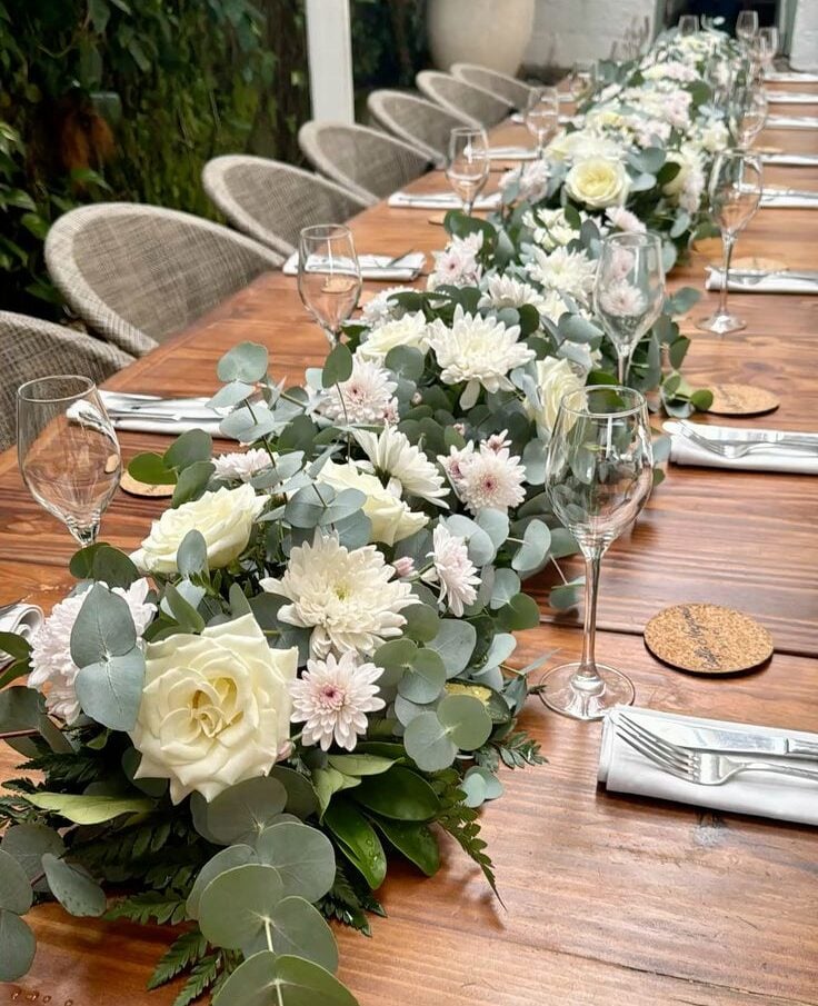 Imagine your table as an extension of a blooming garden. Instead of a compact centerpiece, scatter clusters of florals organically down the center. Small terra cotta pots filled with herbs, daffodils, or hyacinths can be mixed with loose greenery for a relaxed, freshly gathered look. The charm lies in imperfection; arrangements should appear as though they were assembled straight from the backyard. Soft soil-toned hues and natural textures reinforce authenticity. This option feels vibrant, fresh, and beautifully unpolished; perfect for a relaxed family gathering.