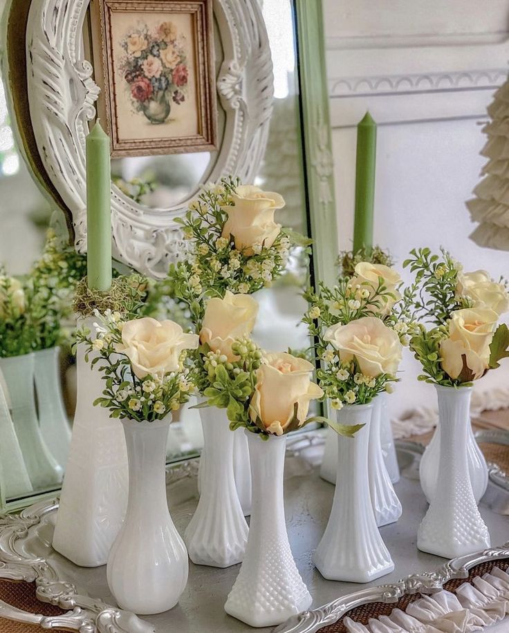 If you love a touch of nostalgia, vintage milk glass creates a refined yet sentimental centerpiece. Instead of relying on one large vessel, gather a mix of varying heights like pedestal bowls, hobnail vases, and compotes; and fill them with delicate spring blooms. Soft whites layered with pale blush or muted lilac feel romantic without overwhelming the table. Because milk glass reflects light beautifully, even a neutral arrangement feels luminous. Pairing this Easter Centerpiece Idea with lace accents or heirloom china enhances the timeless charm. The overall effect feels curated, graceful, and deeply personal.