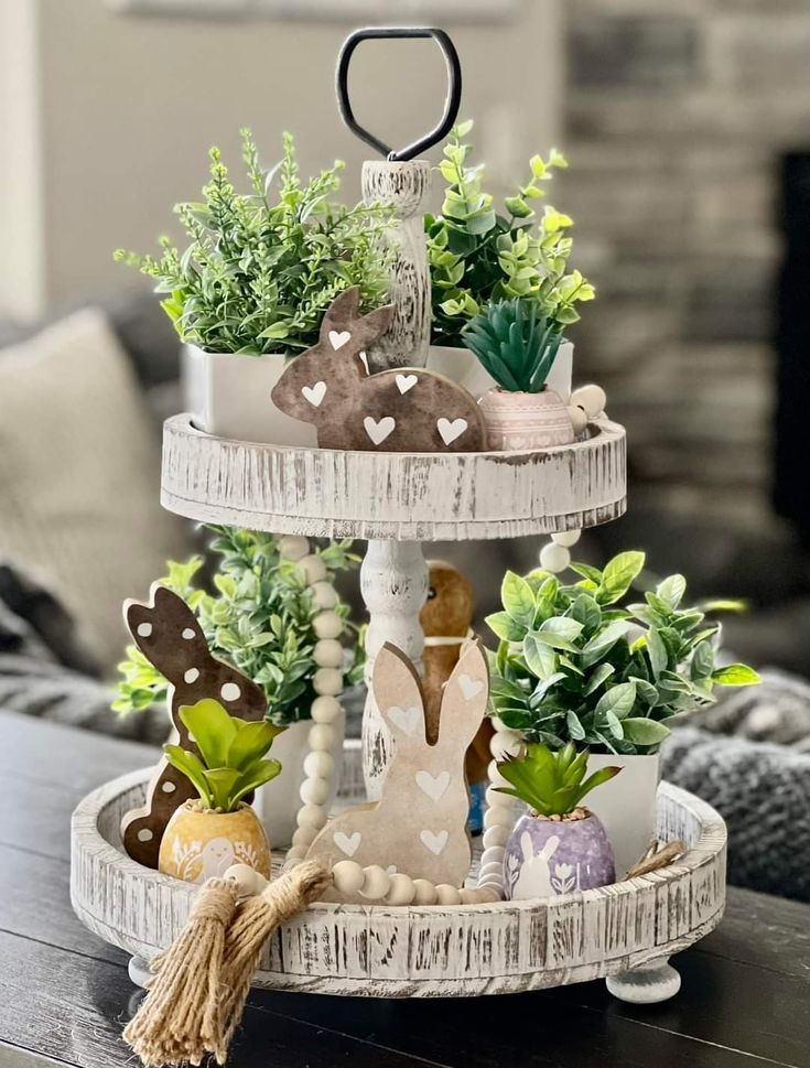 A tiered tray isn’t just for kitchen counters; it can become a vertical centerpiece when styled thoughtfully. Start by filling the lower tier with moss or greenery to create a base. The second level can hold decorative eggs, small florals, or miniature bunnies, while the top tier features a slightly taller floral accent. Because the design rises upward instead of spreading outward, it is a good example of Easter Centerpiece Ideas that works wonderfully for narrower dining tables. Movement between levels adds dimension and keeps the eye traveling. Structured yet playful, this arrangement balances height and detail beautifully.