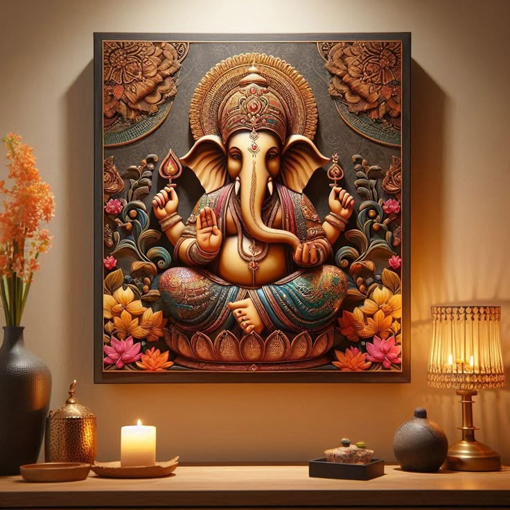 Wall art can make the Ganesh corner feel more complete and visually striking. Instead of placing the idol alone, consider adding a framed image or artwork of Lord Ganesha behind it. This simple addition creates depth and helps the space look more thoughtfully arranged. For example, imagine a small shelf with a Ganesh idol placed in front of a beautifully framed painting of Lord Ganesha. The layered look immediately draws attention to the prayer corner. Another option is to use metal wall art or carved wooden panels featuring traditional designs. These elements work well because they add artistic beauty without taking up too much space.