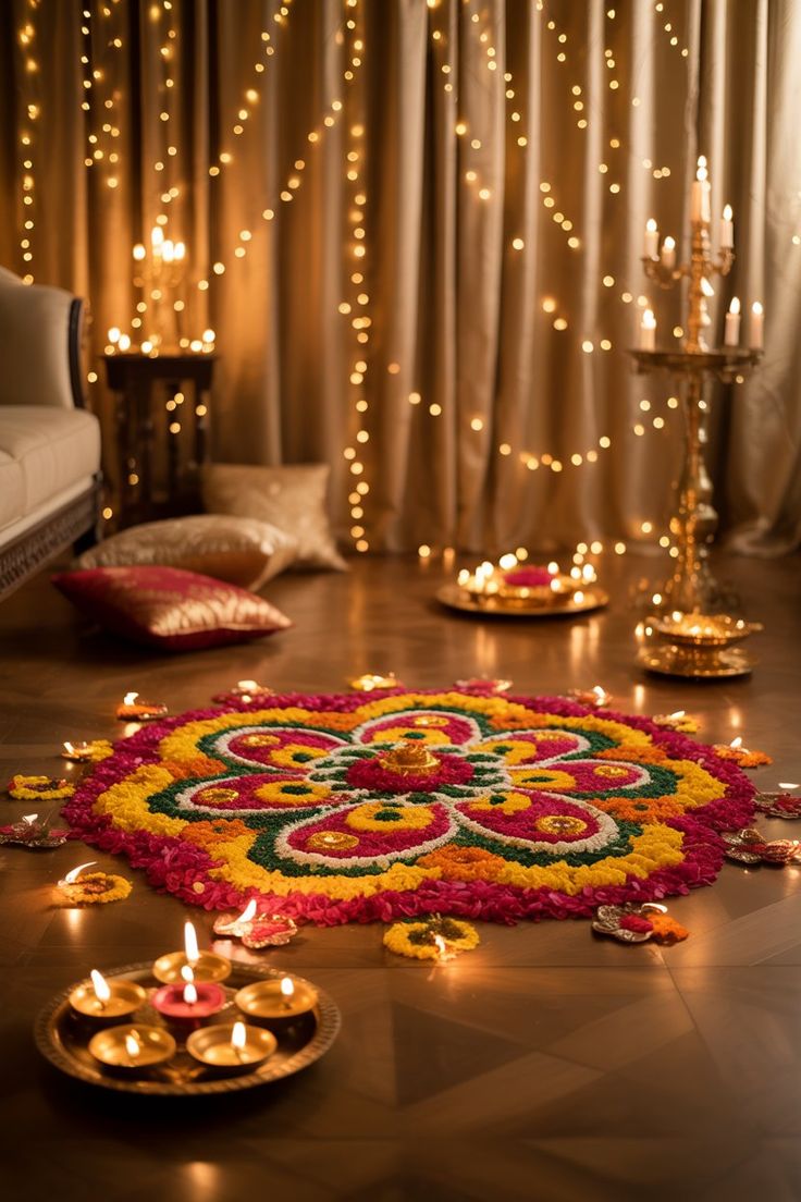 Rangoli designs are a beautiful way to decorate the floor near the prayer space. Instead of using colored powder, you can create a rangoli using fresh flower petals. For instance, marigold, rose, and chrysanthemum petals can be arranged into simple circular patterns. Even a small floral design placed in front of the Ganesh idol can make the setup look festive. Picture a bright flower rangoli on the floor while the Ganesh idol sits slightly above it on a small platform. The combination of colors and fragrance makes the space feel joyful. Additionally, creating rangoli can become a fun family activity. Children and adults can work together to design patterns and decorate the prayer corner.