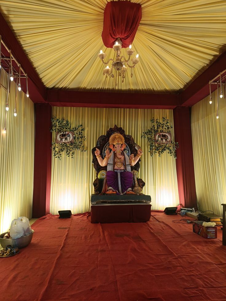 Sometimes decorations look more interesting when objects are placed at different heights. Instead of keeping everything on a single level, you can create layered platforms. For example, the Ganesh idol may sit on a raised platform while smaller decorative items are placed slightly lower. Imagine a setup where the idol sits on a wooden chowki, while small diyas and flowers are arranged on the floor level around it. This layered arrangement adds dimension and makes the entire space feel more thoughtfully designed. Layering is often used in many creative Ganesh Decoration Ideas because it highlights the idol beautifully.