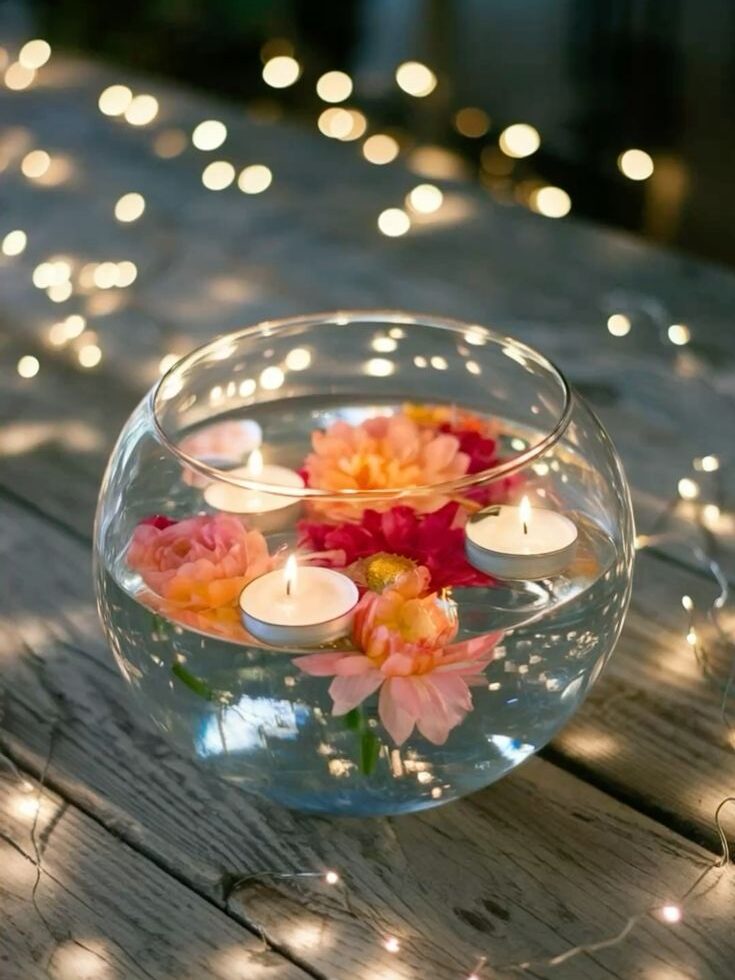 Floating decorations can bring a peaceful and creative touch to the setup. To try this idea, fill a decorative bowl with water and place fresh flower petals inside. Then add small floating candles on top. For instance, imagine a glass bowl placed in front of the Ganesh idol. Rose petals float gently in the water while tiny candles glow softly. The reflection of the candlelight in the water creates a calming and elegant effect. Because of their beauty and simplicity, floating bowls are often used in modern Ganesh Decoration Ideas.
