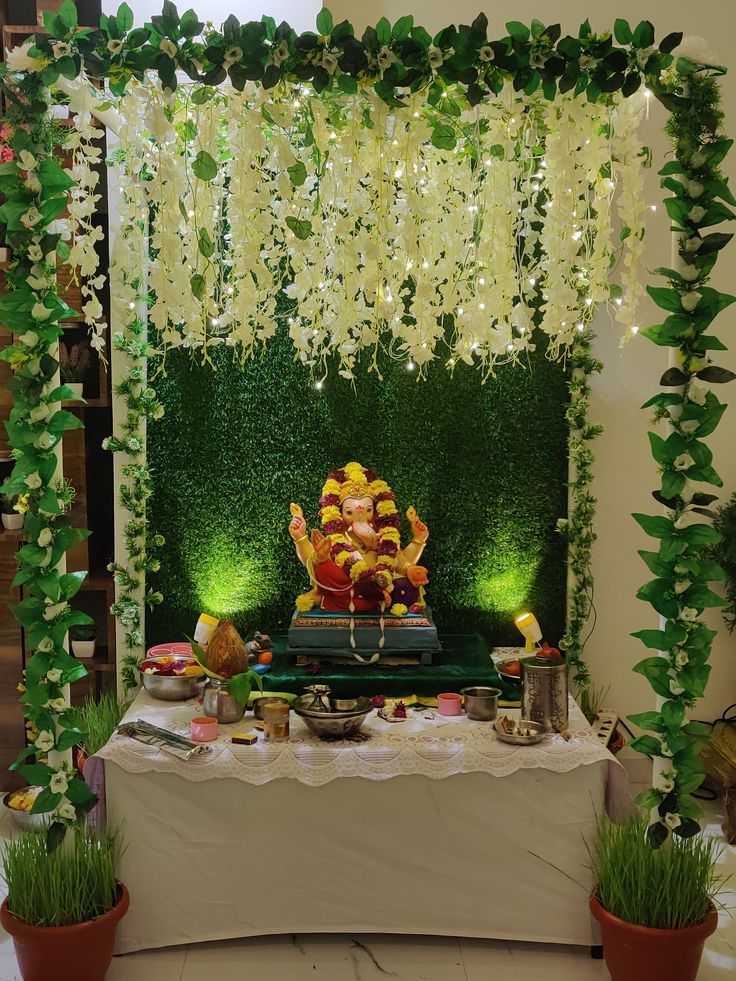 Nature-themed decorations can bring freshness to your prayer space. Instead of using only traditional materials, you can incorporate plants, leaves, and natural textures. For example, small indoor plants can be placed around the Ganesh idol to create a green and peaceful environment. Another idea is to use banana leaves or palm leaves as part of the decoration backdrop. Imagine a small wooden table with a Ganesh idol surrounded by fresh plants and flower garlands. The space feels calm, refreshing, and full of life. Nature-inspired decorations are especially perfect for people who enjoy simple and eco-friendly setups.