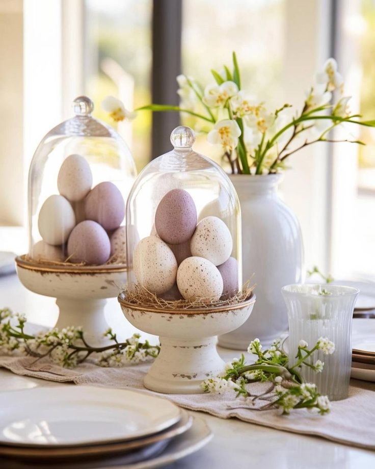 Glass cloches instantly make anything underneath feel intentional and special. For Easter, try placing moss and decorative eggs beneath individual cloches spaced along a runner. Some can feature tiny nests, while others hold a single painted egg or miniature bunny figurine. Varying what’s under each dome prevents the arrangement from feeling repetitive. Since cloches add height without bulk, they create visual drama while still keeping sightlines open. This style blends classic holiday symbolism with modern presentation, offering a subtle yet striking statement.