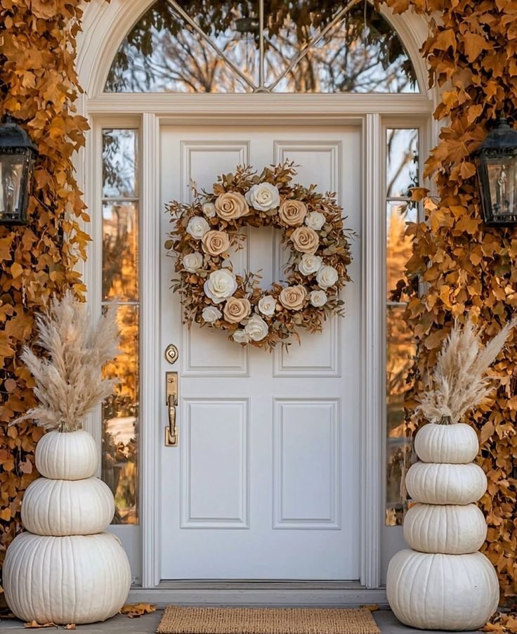 Instead of the typical ghostly or skeleton wreaths, opt for something warm and inviting. Think dried orange slices, cinnamon sticks, and miniature pumpkins woven into a grapevine or twine wreath. You can also add soft ribbons in muted tones like burnt orange, deep burgundy, or mustard yellow for a subtle festive touch.