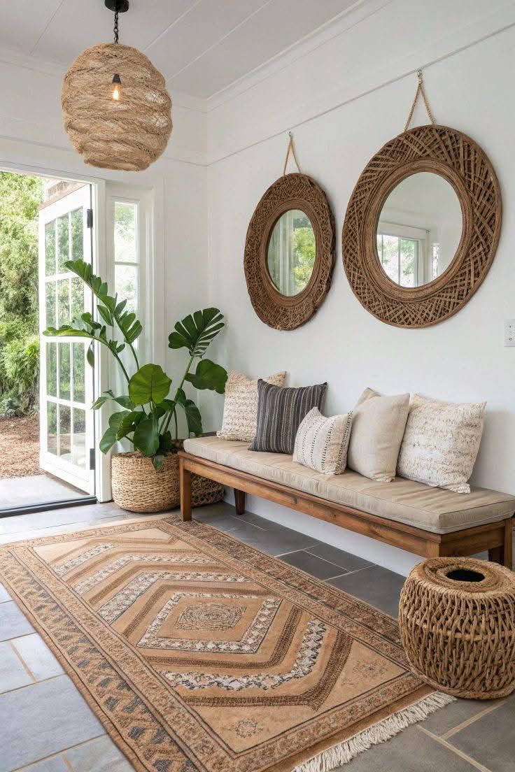 When choosing a rug, consider both style and durability. Low-pile rugs are ideal for busy entryways because they withstand heavy foot traffic. If you have kids, pets, or frequent visitors, look for materials like jute, sisal, or flat-weave cotton that are easy to clean and hold up well. Patterns can be your friend too: subtle geometric designs hide dirt and add interest without overwhelming a small space.